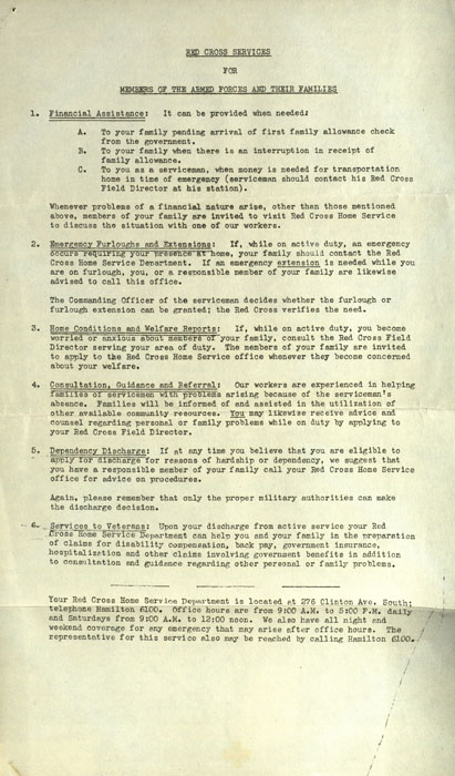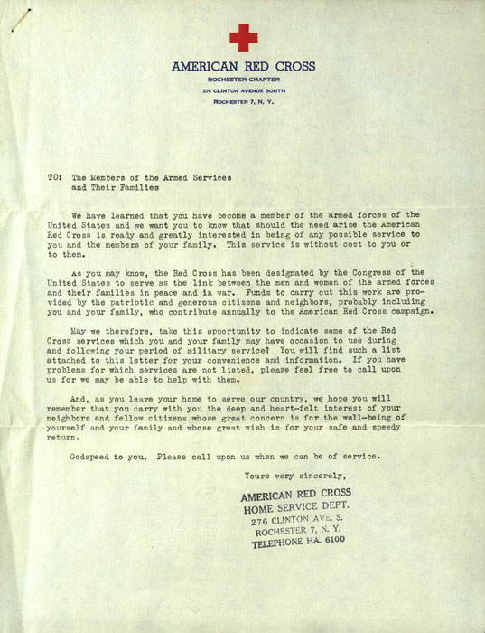 A letter sent from the American Red Cross to Irene Conole and her family upon her enlistment in the Navy. The letter details the many services available from the Red Cross, such as financial assistance, emergency transportation home, and disability compensation.