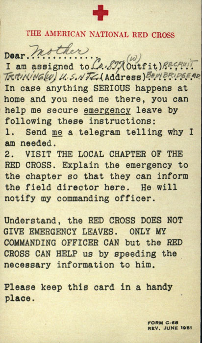 home in time of emergency (serviceman should contact his Red Cross