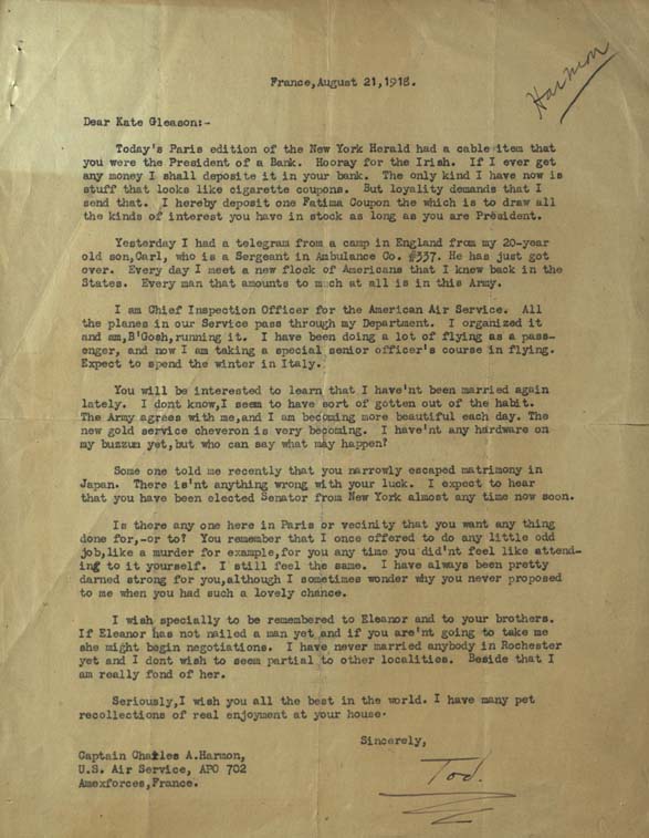 A letter to Kate Gleason from Charles Harmon, captain in the United States Air Service in France. Harmon congratulates Kate on being appointed president of a bank. He provides details about his war experience and teases her about her personal relationships and her narrow escape from matrimony in Japan. Includes Italian currency.