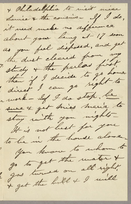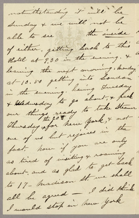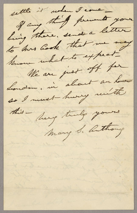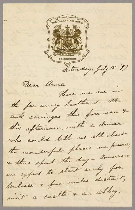 A letter from Mary S. Anthony to the Anthony sisters’ housekeeper and secretary, Anna Dann Mason. Mary updates Anna on her and Susan’s travels in Scotland.  She tells Anna when they expect to arrive home so that Anna can get their house ready for them.