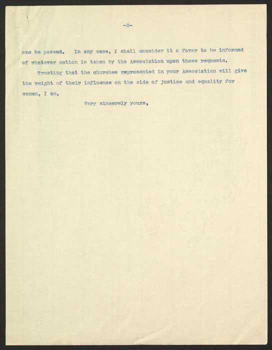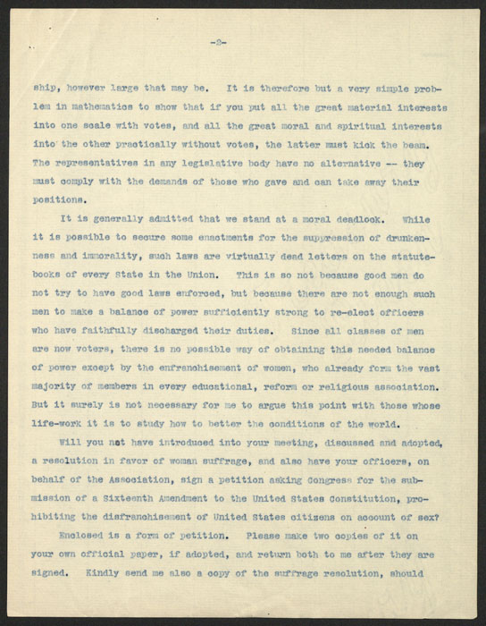 A letter from Susan B. Anthony, on behalf of the National American Woman Suffrage Association (NAWSA), to the American Unitarian Association (AUA). Anthony explains how giving women the right to vote will increase national support for “moral and spiritual interests” and requests that the AUA pass a resolution in favor of woman suffrage. She also asks that the organization’s officers sign a petition to Congress for a federal woman suffrage amendment.