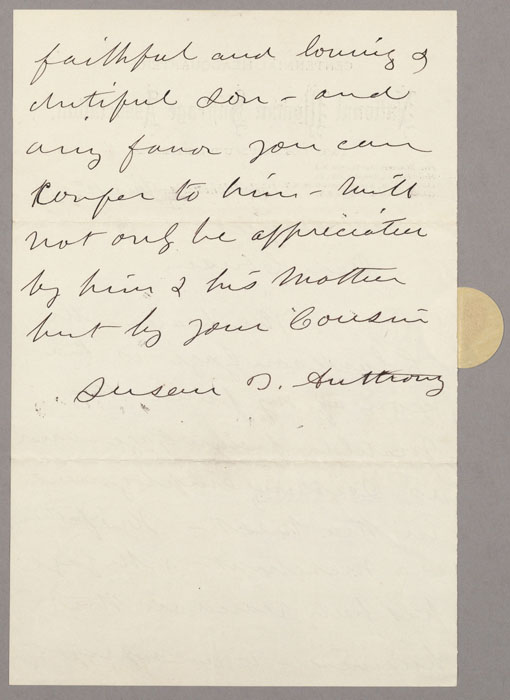 A letter from Susan B. Anthony to her cousin, Charles Boyles. Susan requests that Charles help Clarkson Gage, the son of her friend and fellow women’s rights activist Matilda Joslyn Gage, to find employment in the West.