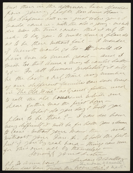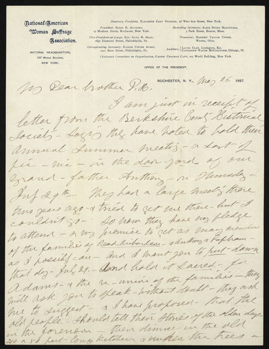 A letter from Susan B. Anthony to her brother, Daniel Read Anthony. Susan reports that the Berkshire County Historical Society will hold its annual meeting at the Anthonys’ old family home in Adams, Massachusetts, and would like for as many family members as possible to attend. Susan hopes to use the occasion for a family reunion and wants her brother and his wife to be there.