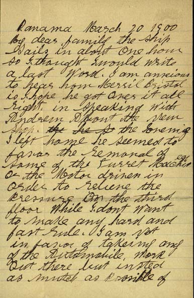 The letter is apparently misdated as March 20, 1900. It was written during William’s trip through Panama on his way to the West Coast, which he took in 1906.
