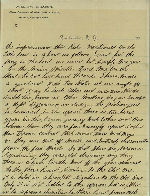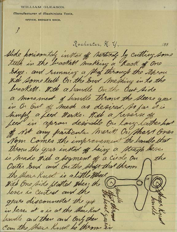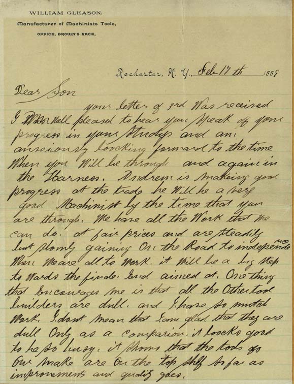A letter from William Gleason to his son, James Gleason. William reports that work has been busy and that other companies similar to theirs are “dull,” meaning they are not doing as well. He predicts that his other son, Andrew, will one day be a “very good machinist.” William provides a detailed, illustrated description of his new invention. He tells Jim that he expects him to come home during his school break in March.