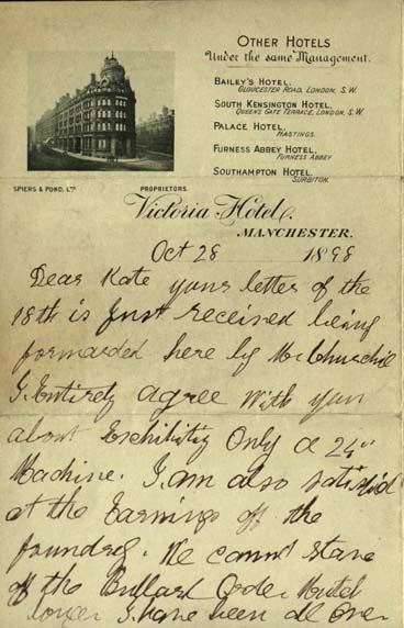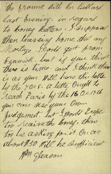 A letter to Kate Gleason from her father, William Gleason. William responds to business matters included in a previous letter from Kate and asks her to handle an unsettled financial situation.
