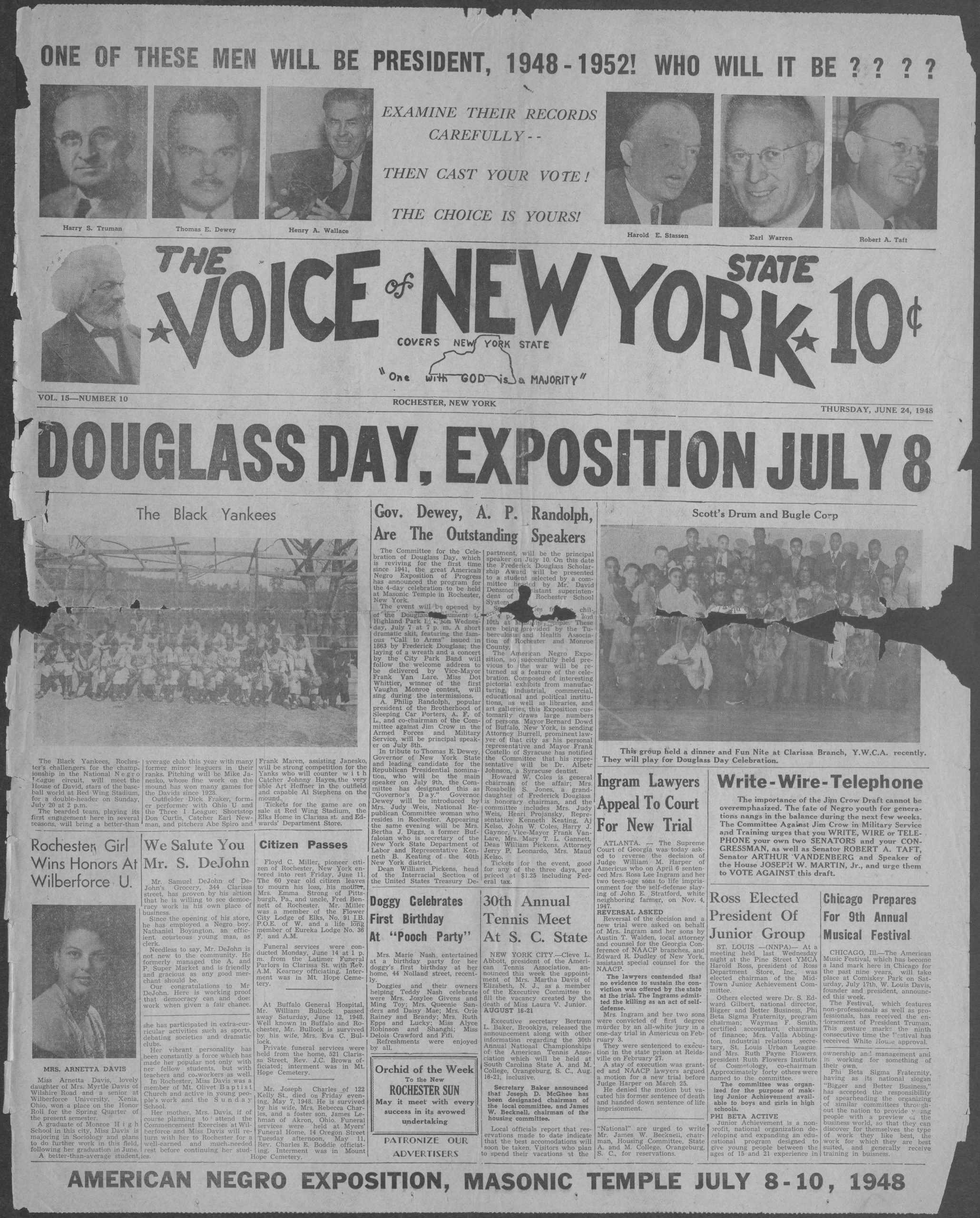 This issue of The Voice features articles about The Black Yankees and the revival of the Douglass Day Celebration for the first time since 1941. Another article, written by Alma Kelso Coles, investigates “a change in the employment scene” and describes and lists members of the Black community and their employers. A third article explains the Legal Aid Society and its function so readers can know how to obtain such aid.