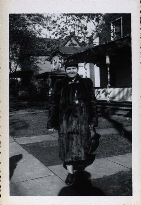 A photograph of a woman wearing a fur coat and hat in front of a house.