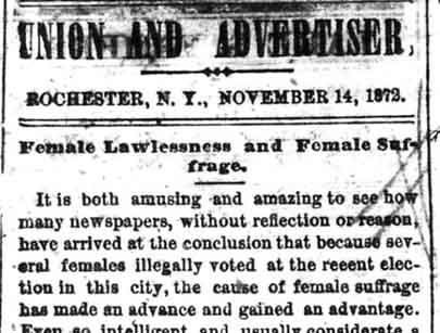 Excerpt from a newspaper article reacting to the illegal voting of 15 women in Rochester, NY. From Susan B. Anthony Scrapbooks 1848-1900, volume 6. Accessed on microfilm at the Rochester Public Library Local History Division.